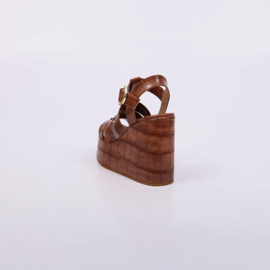 Eloah – Sandália Feminina Salto Anabela Croco com Tiras Caramelo