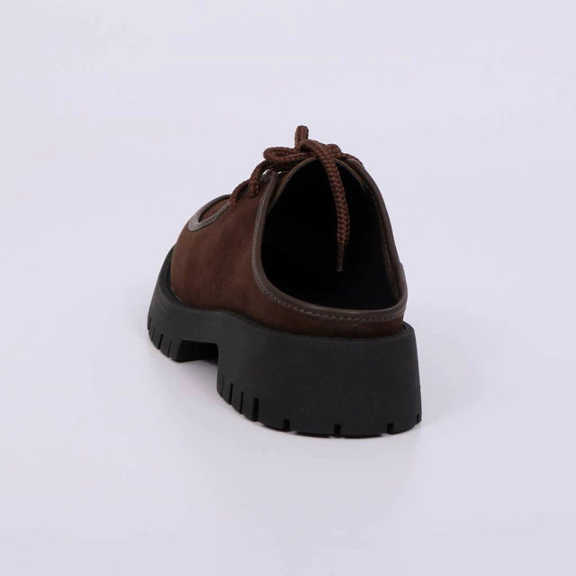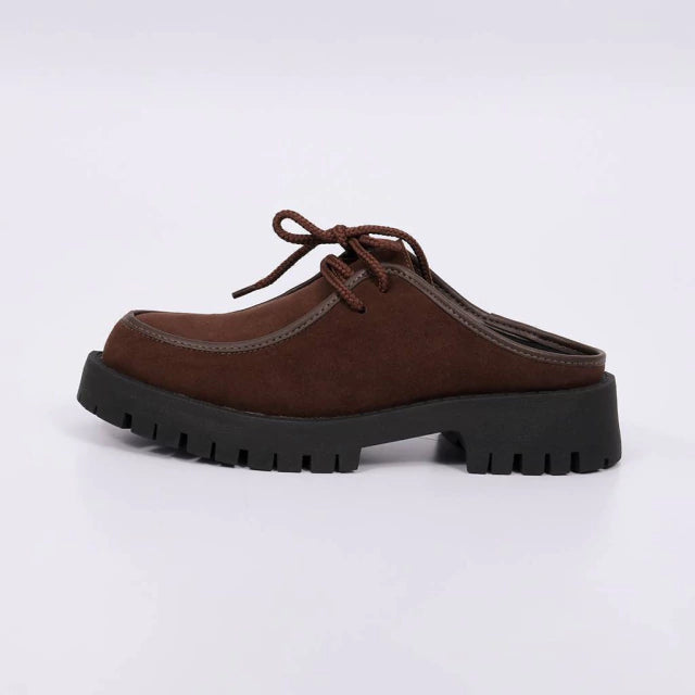 O Mule Emily Combina o Acabamento em Camurça com o Detalhe de Cadarço, Trazendo um Visual Despojado e Atual. O Design Fechado Valoriza o pé com Conforto, Enquanto o tom marrom escuro Reforça a Proposta Versátil e Contemporânea.