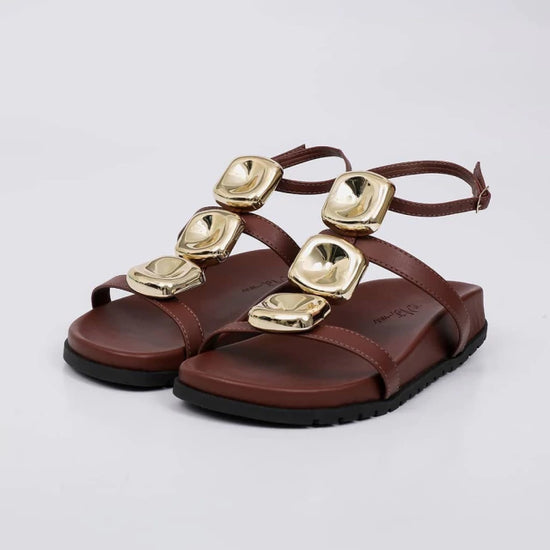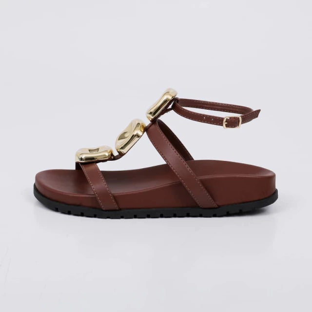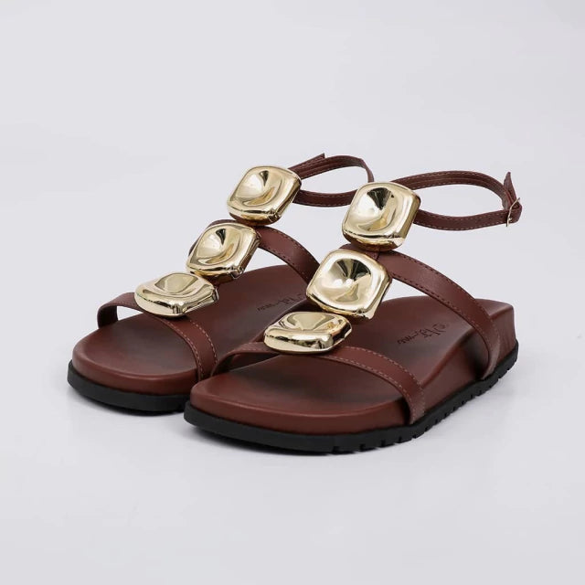 O Cabedal com Tiras Largas e Aplicações Metálicas Douradas traz um toque de Sofisticação e Personalidade ao Visual, destacando o modelo com atitude.