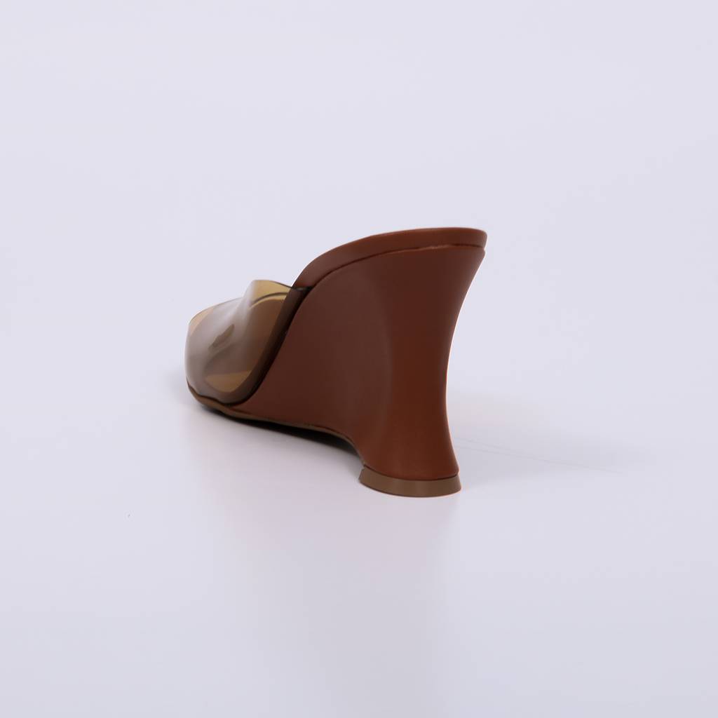 Lola – Tamanco Feminino Salto Anabela Vinil Caramelo