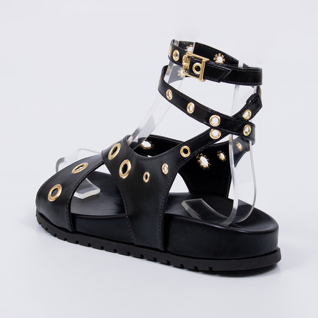 Mia - Sandália Papete Feminina Anatômica Ilhós Dourado Preto