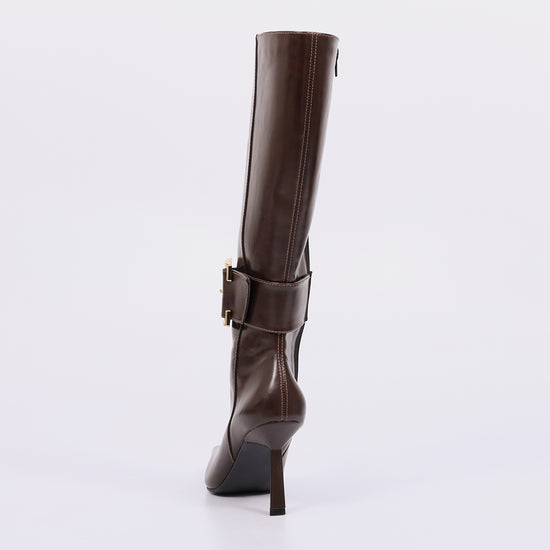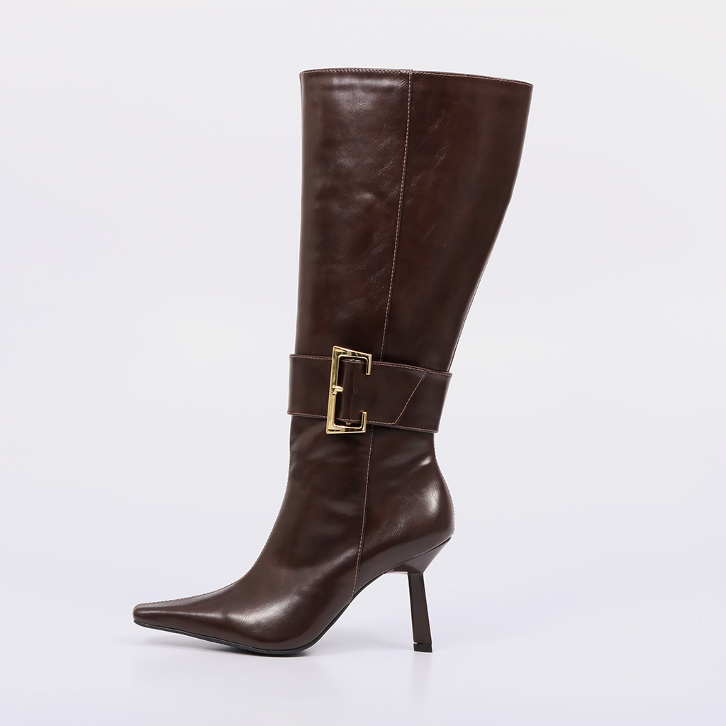 Perla – Bota Feminina Elegante Cano Médio Salto Fino Fivela Marrom Escuro