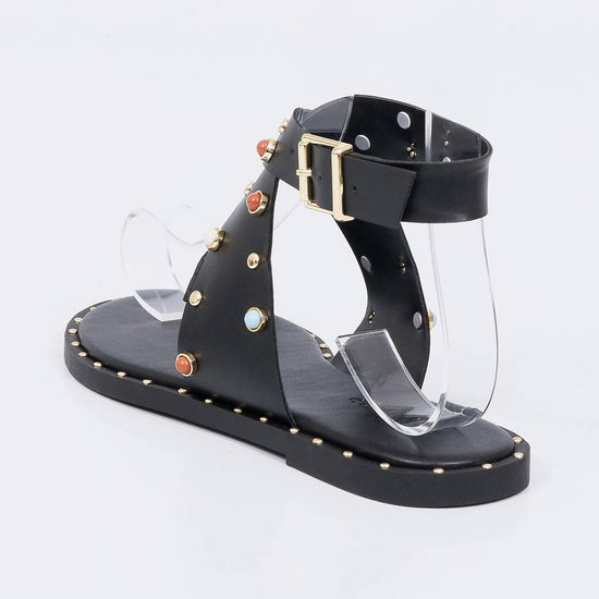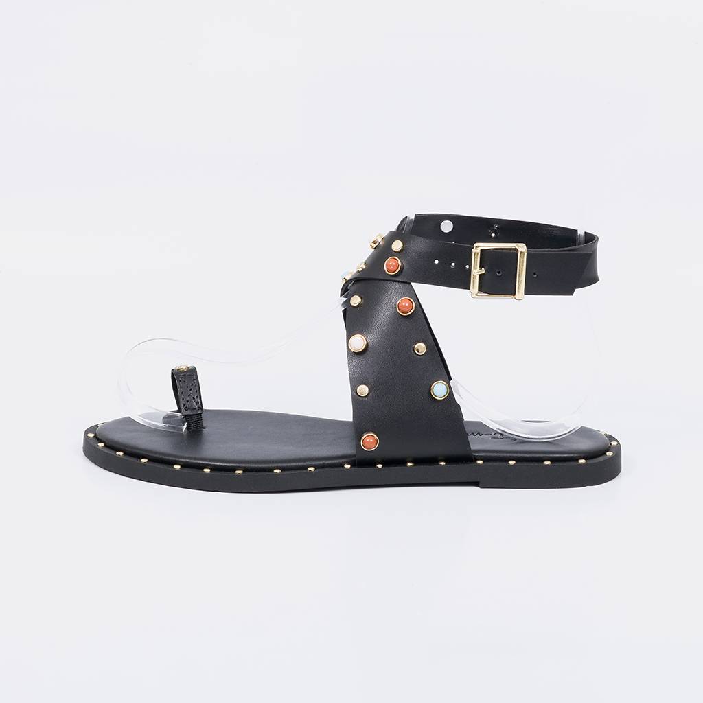Sue - Sandália Rasteira Feminina Tiras Grossas Aplicação Preto