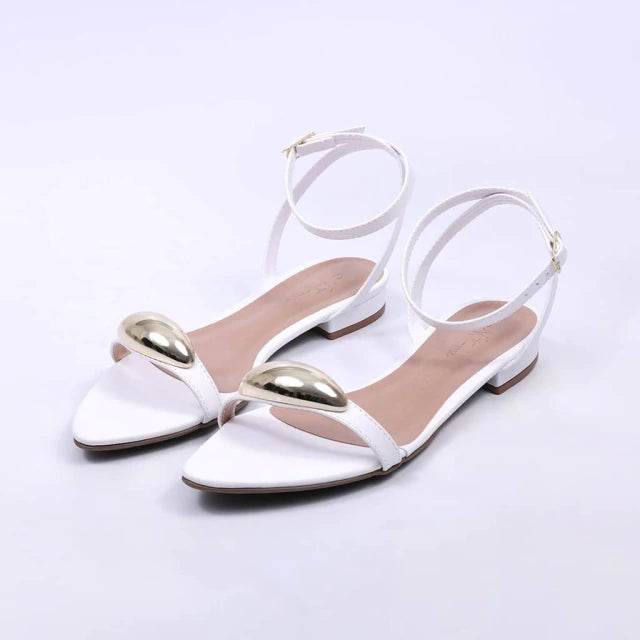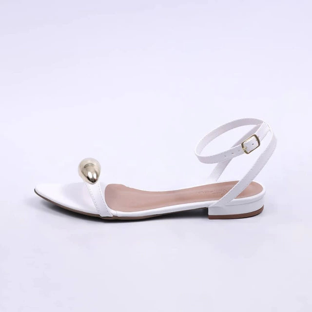 Valence - Sandália Rasteira Feminina Bico Folha Aplicação Branca